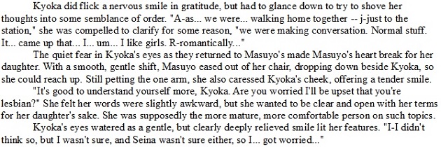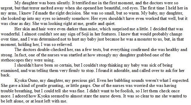 Masuyo doesn't care about that. She loves her daughter, and getting through the day-to-day challenges of the modern world is more than enough. Kyoka loves her mother, and tries to balance her desire to fight with her promise to be safe.