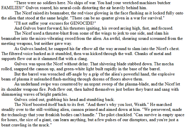 By all reports, the Wraiths were wiped out. The genocide of this alien race allowed humanity to cement control of the galaxy. The giant robots used to defeat the Wraiths became an economic corner-stone, and the largest training academy for their pilots serves as a test-bed for the latest models and corporate propaganda.